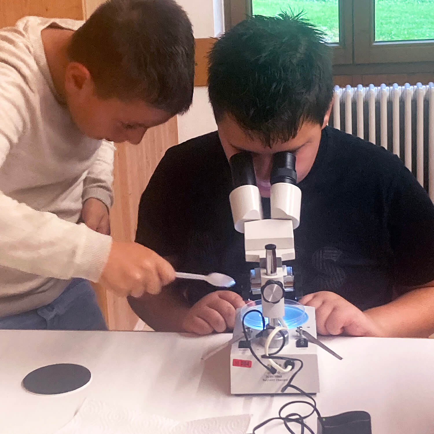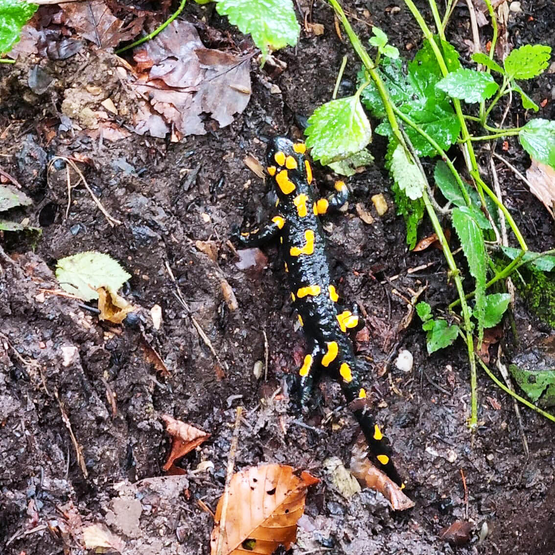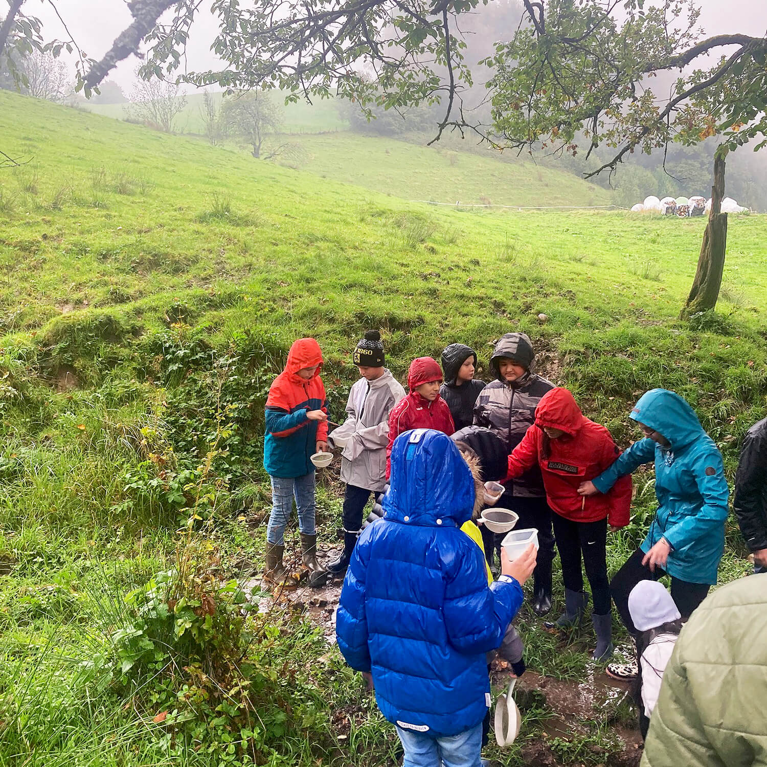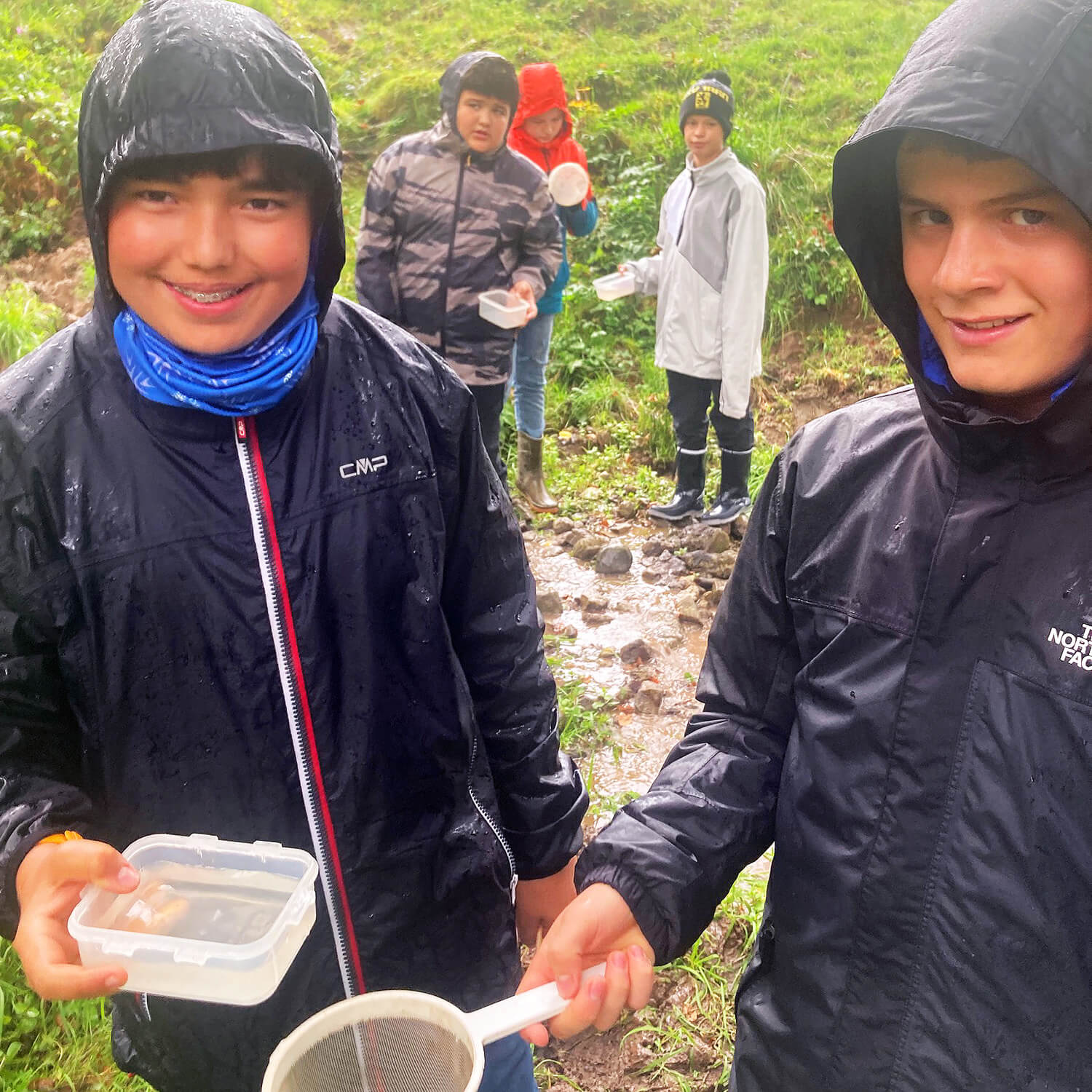 Am nächsten Tag, nach einem ausgiebigen Frühstück, kam eine Biologin und wir gingen mit den Schülern in strömenden Regen zu einem nahegelegenen Bergbach. Dort nahmen alle Wasserproben mit kleinen Wassertierchen, die anschließend unter einem Stereomikroskop beobachtet wurden. Die heilende Wirkung von Wasser wurde uns anschließend mit Kneippschen Arm- und Augengüssen erklärt. Nach einem stärkendem Mittagessen machten wir uns auf dem Weg zum Gipfelkreuz und beobachteten gleich mehrere Feuersalamender.