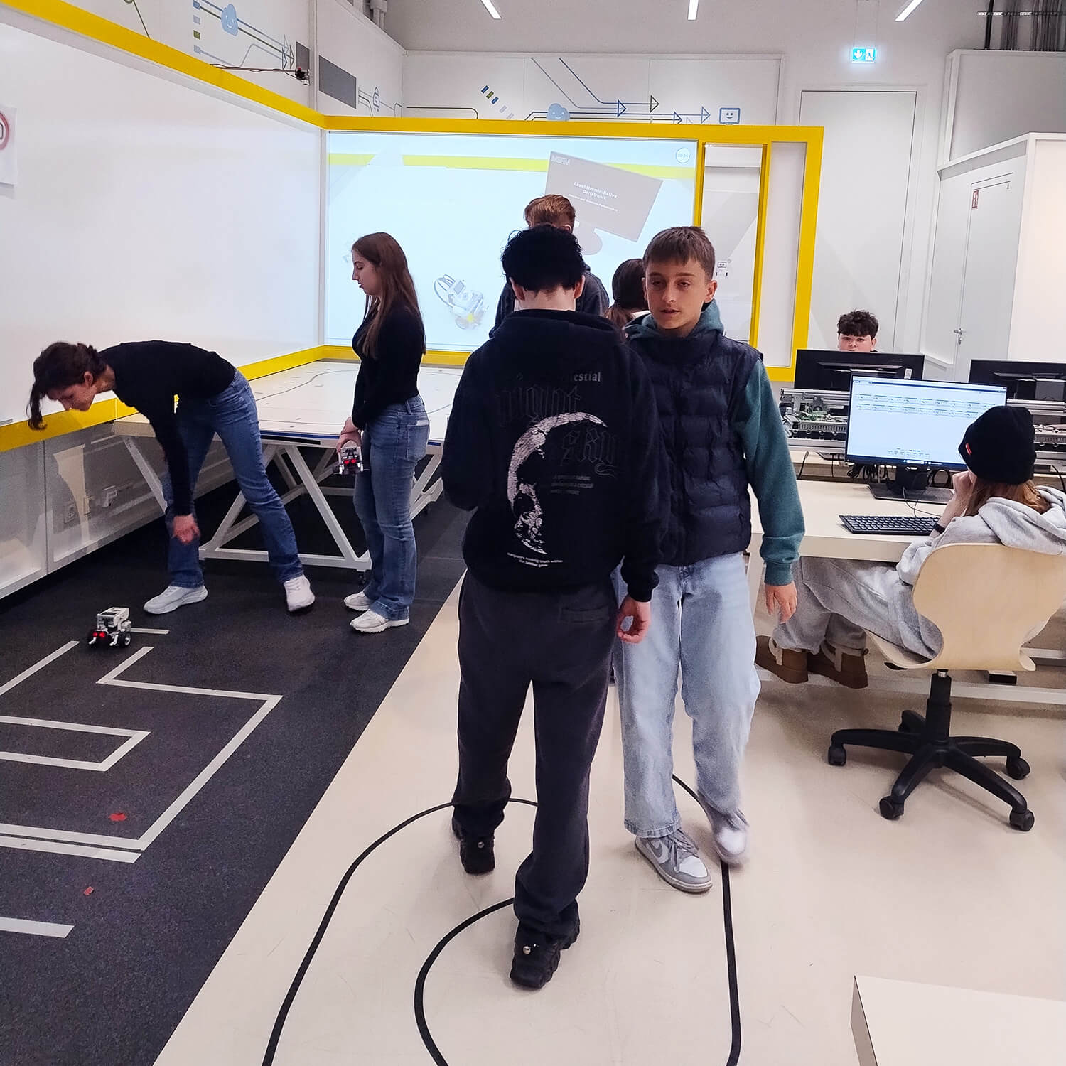 Besonders anschaulich wurde der Workshop durch die Verbindung von Programmierung, Technik und Bewegung. Die Roboter mussten auf einem Parcours fahren, Linien erkennen und Aufgaben möglichst präzise bewältigen. Auf diese Weise erlebten die Schülerinnen und Schüler ganz praktisch, wie wichtig logisches Denken, genaues Beobachten und gemeinsames Problemlösen in der Technik sind.